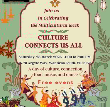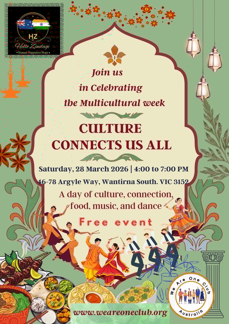 This event is a joyful community celebration proudly presented in collaboration between We Are One Club and Hello Zindagi, supporting the Victorian Multicultural Commission’s Multicultural Week initiatives.