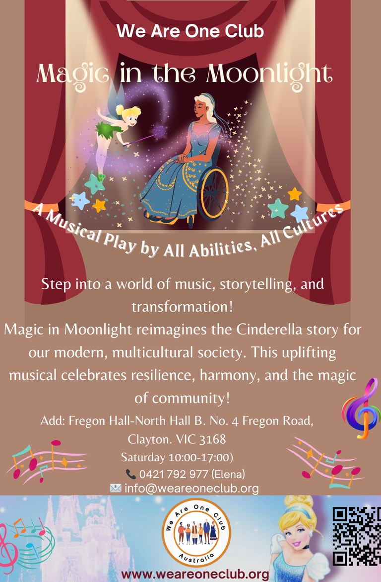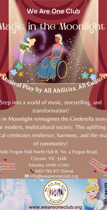 We Are One Club (WAOC) is excited to announce our upcoming Magic in the Moonlight: A Cinderella Story. We are looking for passionate individuals of all abilities to join us as volunteer performers. This unique project aims to showcase the incredible talents of people with disabilities; no prior experience is required to participate.